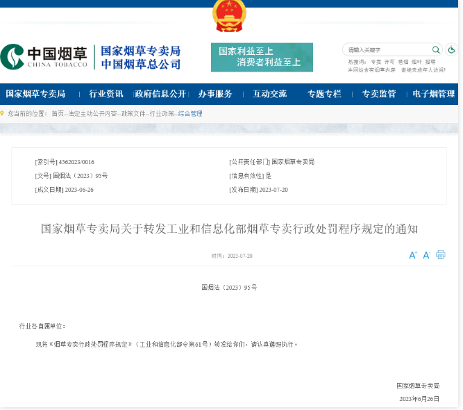 由工业和信息化部修订并公布的《烟草专卖行政处罚程序规定》,已于2023年7月20日开始施行,2010年1月21日公布的《烟草专卖行政处罚程序规定》同时废止。7月20日,国家烟草专卖局转发了《烟草专卖行政处罚程序规定》。据了解,本规定共十章93条,适用于各级烟草专卖局实施行政处罚,也适用于烟草专卖局对涉及电子烟等新型烟草制品的违法行为实施行政处罚。7月24日,贯彻落实《烟草专卖行政处罚程序规定》电视电话会议在北京召开。国家烟草专卖局党组成...