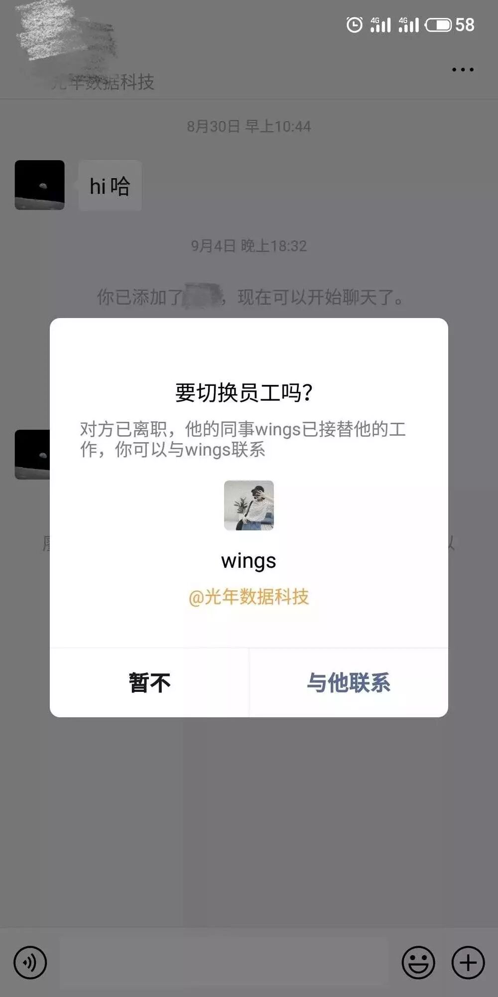 此处有一个坑——员工离职时,他之前所服务的老客户会收到一条通知,询问是否接受换一个人给自己提供服务,显然这里无可避免地会有一部分客户要流失掉,大家也不确定企业微信官方什么时候把这个坑填上。